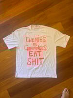 ‘Enemies’ white T Shirt with fluro uv active orange text (size 26 70s style chest 120cm)