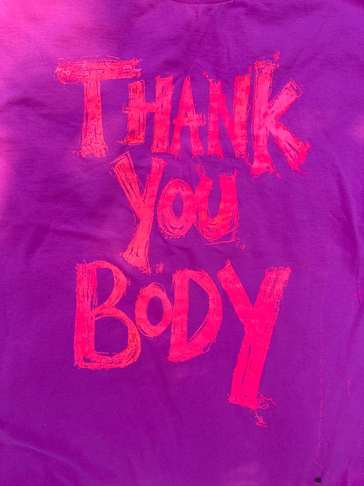 Gentle pink t shirt with orange and pink uv active text. Each shirt is unique and hand screen printed by Grumble herself. First wash seperate on a cold cycle and then cold washes in the mix. Enjoy!