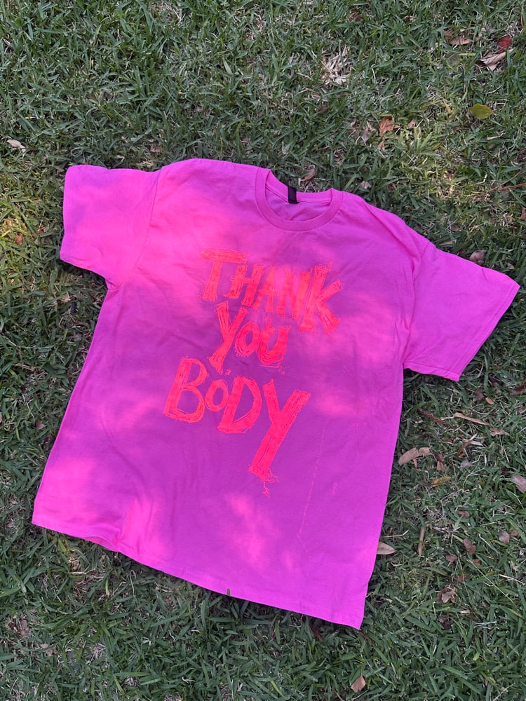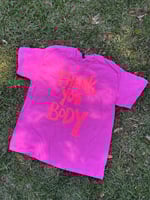 Gentle pink t shirt with orange and pink uv active text. Each shirt is unique and hand screen printed by Grumble herself. First wash seperate on a cold cycle and then cold washes in the mix. Enjoy!