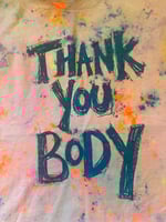Green and blue multi colour tie dye shirt with teal text. Each shirt is unique and hand screen printed by Grumble herself. First wash seperate on a cold cycle and then cold washes in the mix. Enjoy!