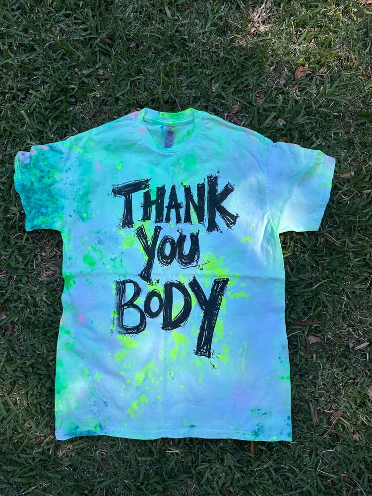 Green multi colour tie dye shirt with deep green text. Each shirt is unique and hand screen printed by Grumble herself. First wash seperate on a cold cycle and then cold washes in the mix. Enjoy!