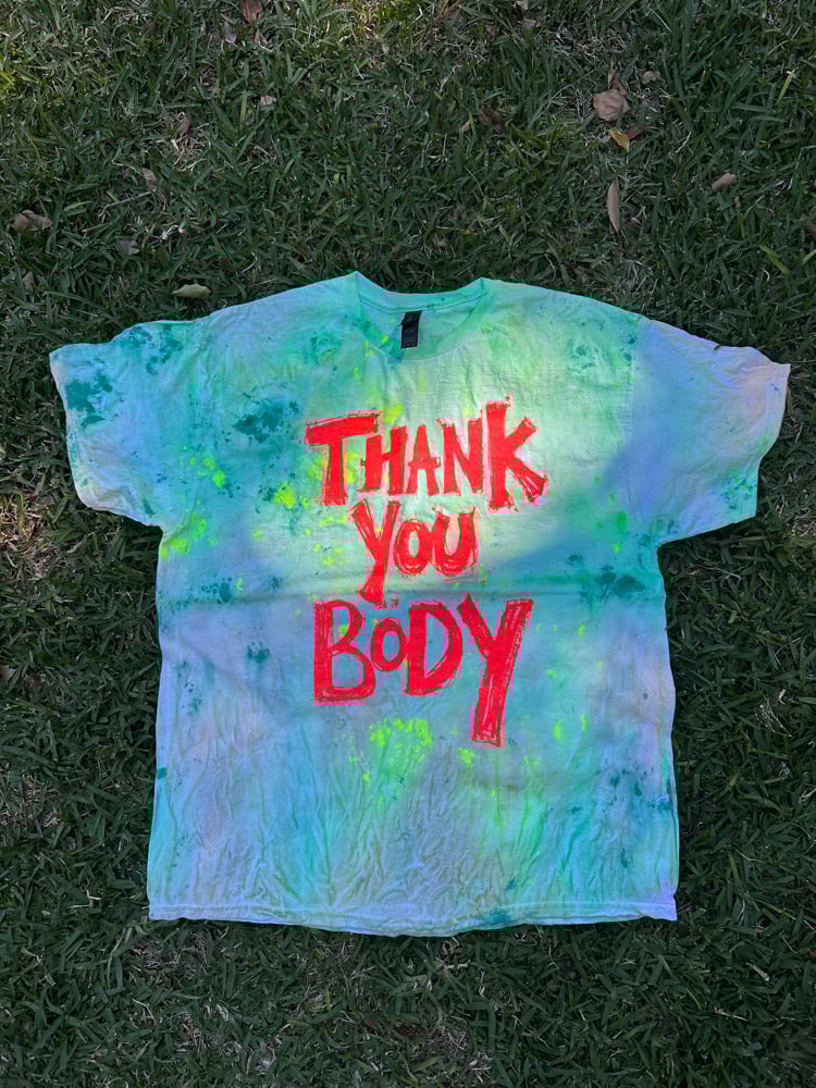 Green multi colour tie dye shirt with fluro orange uv active text. Each shirt is unique and hand screen printed by Grumble herself. First wash seperate on a cold cycle and then cold washes in the mix. Enjoy!