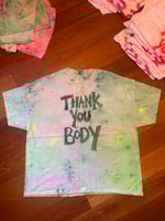 Green multi colour tie dye shirt with mossy green text. Each shirt is unique and hand screen printed by Grumble herself. First wash seperate on a cold cycle and then cold washes in the mix. Enjoy!