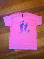 Pink shirt with purple pussy print. Wash cold and seperate first and then cold in the mix. Enjoy!