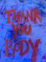 Blue and purple multi colour tie dye shirt with orange text. Each shirt is unique and hand screen printed by Grumble herself. First wash seperate on a cold cycle and then cold washes in the mix. Enjoy!