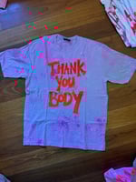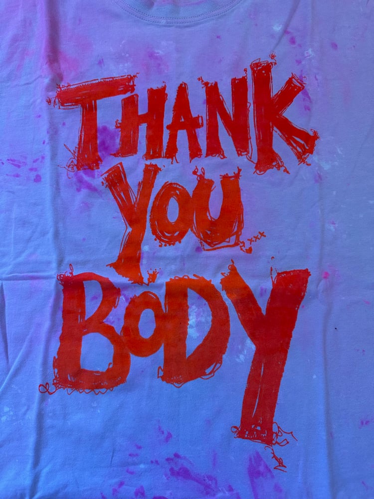 Pink and purple multi colour tie dye shirt with bright orange text. Each shirt is unique and hand screen printed by Grumble herself. First wash seperate on a cold cycle and then cold washes in the mix. Enjoy!