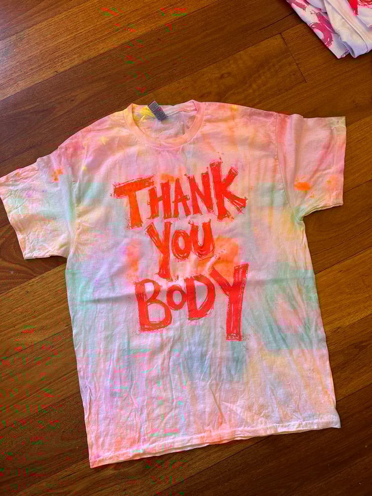 Rainbow multi colour tie dye shirt with fluro orange text. Each shirt is unique and hand screen printed by Grumble herself. First wash seperate on a cold cycle and then cold washes in the mix. Enjoy!