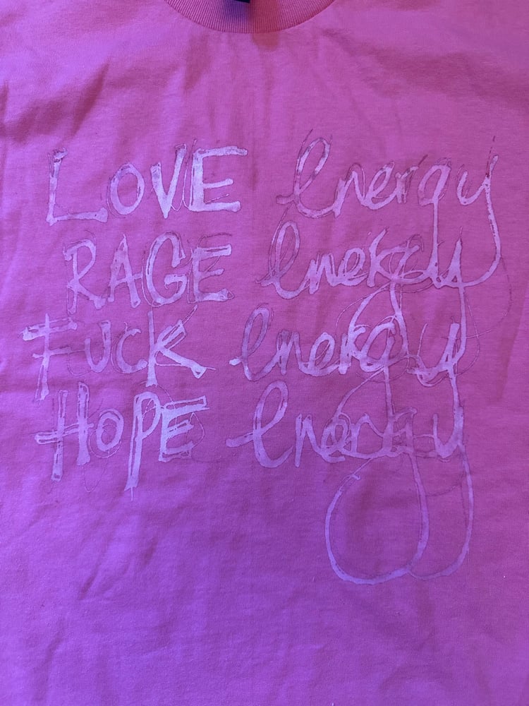 White t Shirt with ‘energies’ in purple text. Wash cold and seperate first and then cold in the mix. Enjoy!