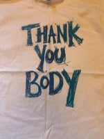 White shirt with teal text. Each shirt is unique and hand screen printed by Grumble herself. First wash seperate on a cold cycle and then cold washes in the mix. Enjoy!
