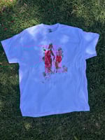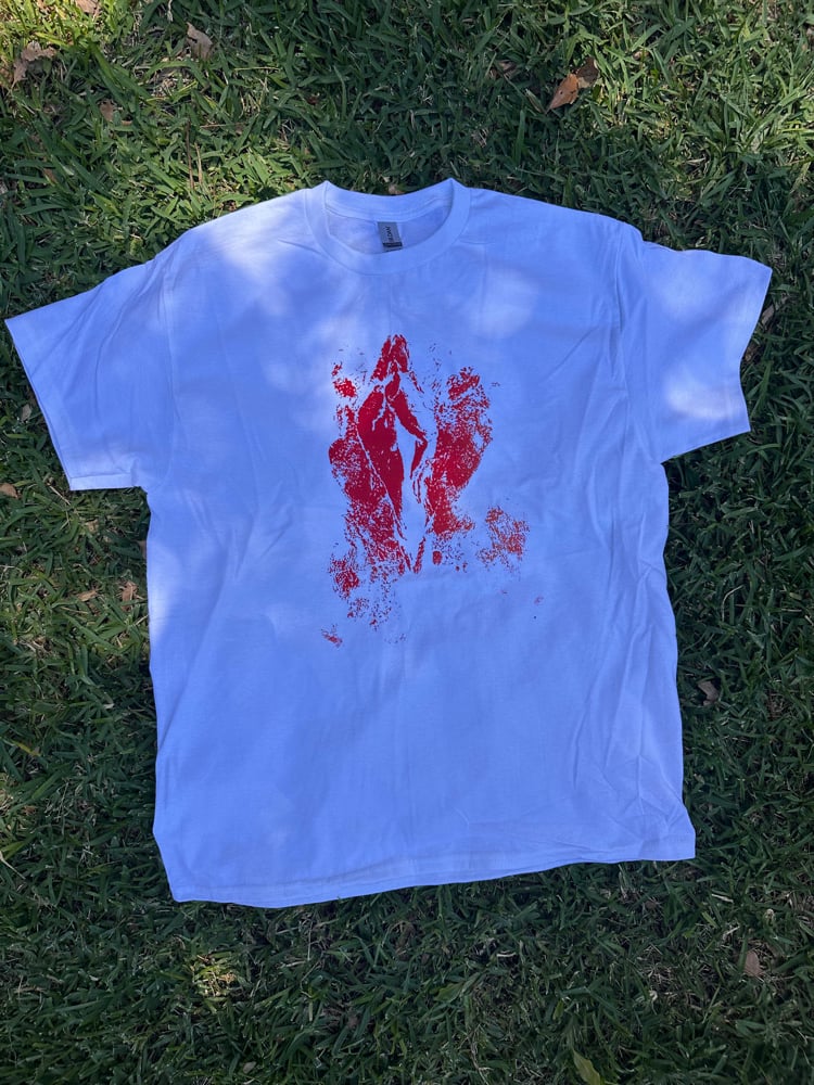 White t shirt with red pussy print. Wash cold and seperate first and then cold in the mix. Enjoy!