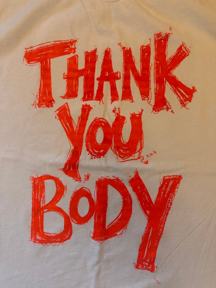 White shirt with orange text. Each shirt is unique and hand screen printed by Grumble herself. First wash seperate on a cold cycle and then cold washes in the mix. Enjoy!