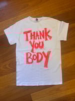 White shirt with orange text. Each shirt is unique and hand screen printed by Grumble herself. First wash seperate on a cold cycle and then cold washes in the mix. Enjoy!