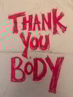 White shirt with pink text (in varying gradients) . Each shirt is unique and hand screen printed by Grumble herself. First wash seperate on a cold cycle and then cold washes in the mix. Enjoy!
